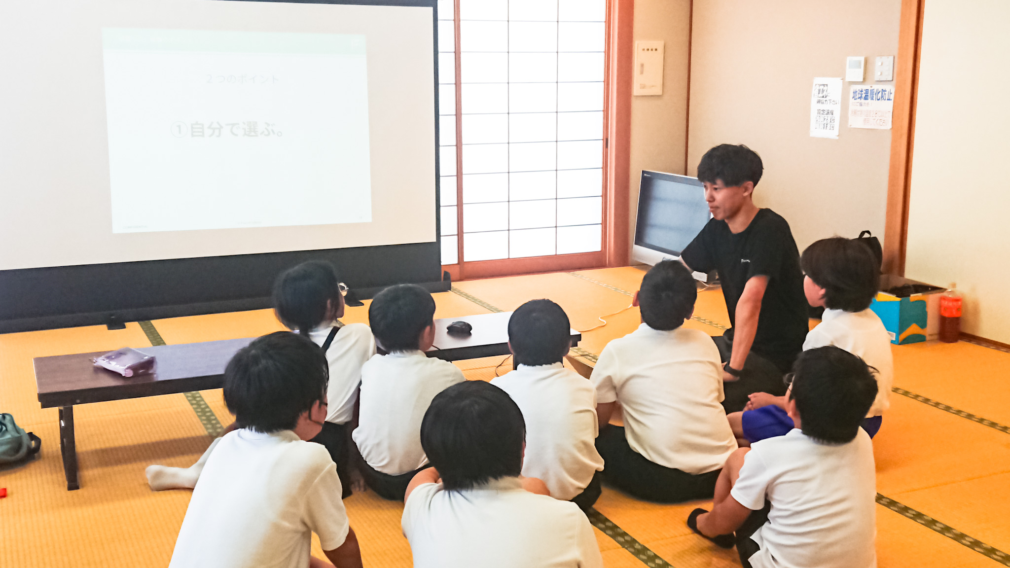公設塾「放課後教室サン」には、美浜町内の小中学生約70人が通塾。サンでは、興味関心を深めるテーマ型授業と、自らの興味関心などをテーマにプロジェクトを企画・実施するマイプロジェクト、地域課題にチームで取り組むPBL(課題解決型学習)を提供しています。